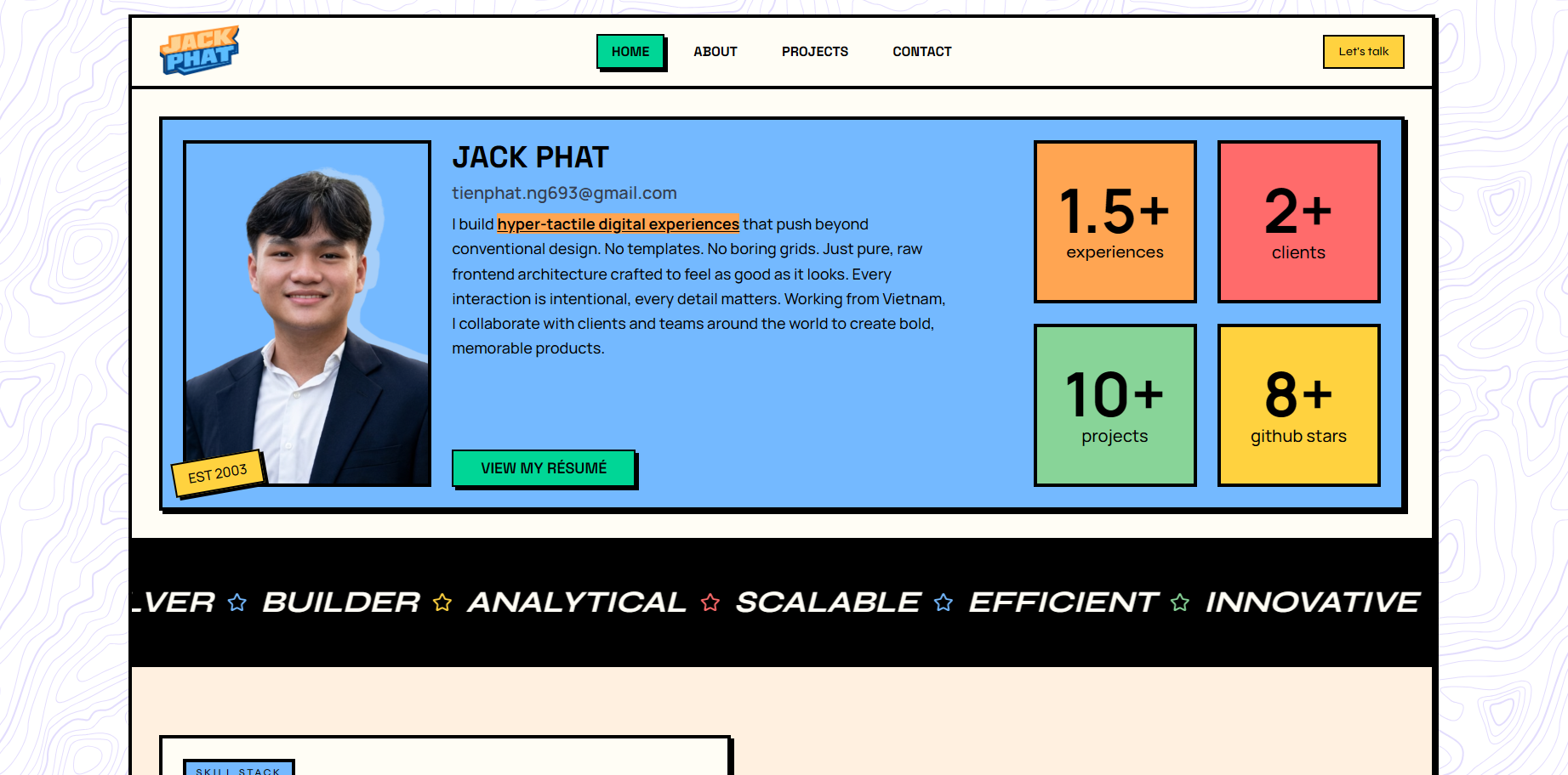 I build hyper-tactile digital experiences that push beyond conventional design. No templates. No boring grids. Just pure, raw frontend architecture crafted to feel as good as it looks. Every interaction is intentional, every detail matters. Working from Vietnam, I collaborate with clients and teams around the world to create bold, memorable products.
